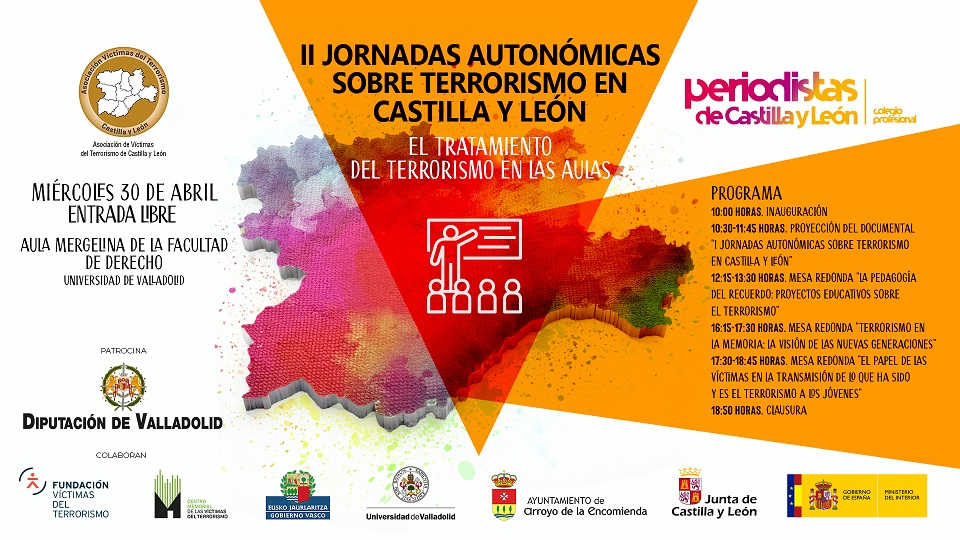 Estas jornadas cuentan con el apoyo de la Diputación de Valladolid y la colaboración de la Fundación Víctimas del Terrorismo, el Centro Memorial de Víctimas del Terrorismo, el Gobierno Vasco, la Universidad de Valladolid, el Ayuntamiento de Arroyo de la Encomienda, la Junta de Castilla y León y el Ministerio del Interior.
